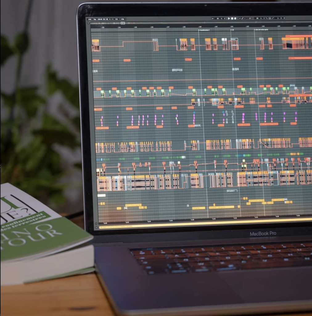 Actuellement, l’écriture de la pièce est terminée. Prochaine étape : mixage des 500 pistes que contient la pièce.